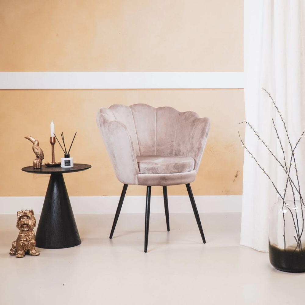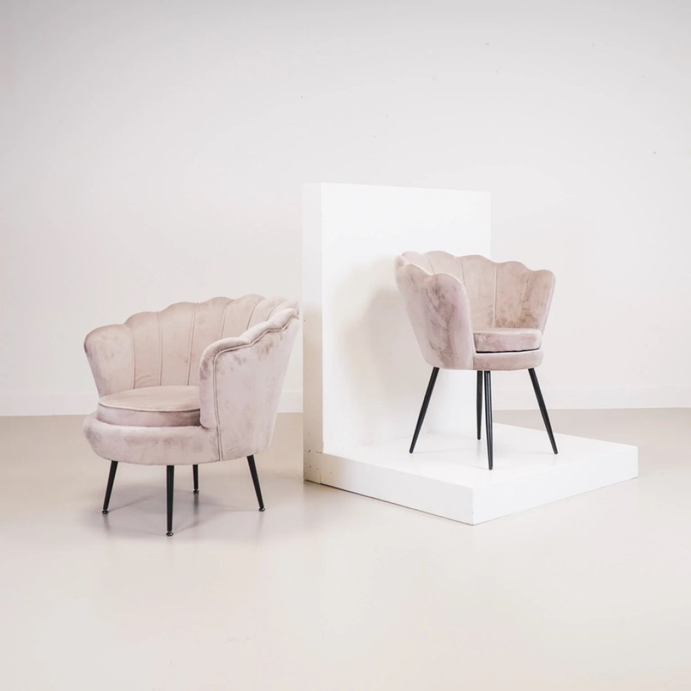 Hier knapt een interieur van op! Deze velvet stoel in de vorm van een schelp staat zowel sjiek als speels.