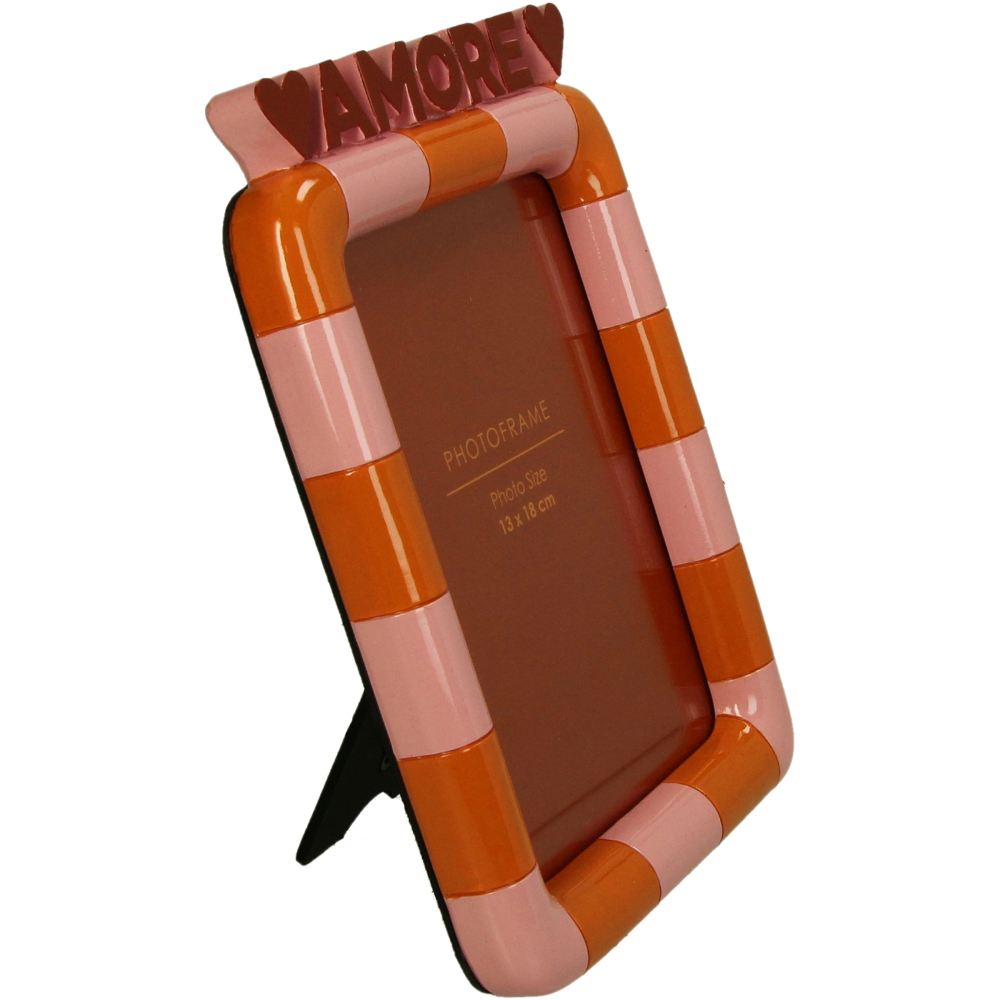 Het juiste cadeau voor iemand waar je gek op bent. Wil je een speels accent toevoegen aan je interieur zonder in te leveren op stijl? De gestreepte fotolijst met Amore tekst in terra, roze met bordeaux kleur 13x18cm is een opvallende en charmante keuze die elke foto net dat beetje extra geeft. Deze unieke lijst in een zachte roze met bordeaux en oranje kleur heeft een gestreept design met tekst – een originele twist voor wie houdt van iets anders dan standaard. Met zijn vrolijke uitstraling en subtiele glans is deze fotolijst ideaal om je favoriete momenten stijlvol in de spotlight te zetten. Perfect als eyecatcher op een bureau, in een open kast of op een nachttafeltje. Het compacte formaat van 13x18 cm is een mooi geschenk voor je partner voor het delen van een mooie herinnering.