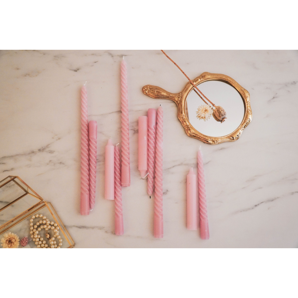 Deze roze twisted kaarsen zijn ideaal voor interieurs die een vleugje zachtheid kunnen gebruiken. De kleur straalt warmte en vrolijkheid uit, terwijl het gedraaide design net dat beetje extra flair toevoegt. Ze passen perfect bij een romantische sfeer, maar werken ook verrassend goed in een modern of minimalistisch decor. Zet ze per set van vier in dezelfde kandelaars voor een strak geheel, of verspreid ze speels door je huis.