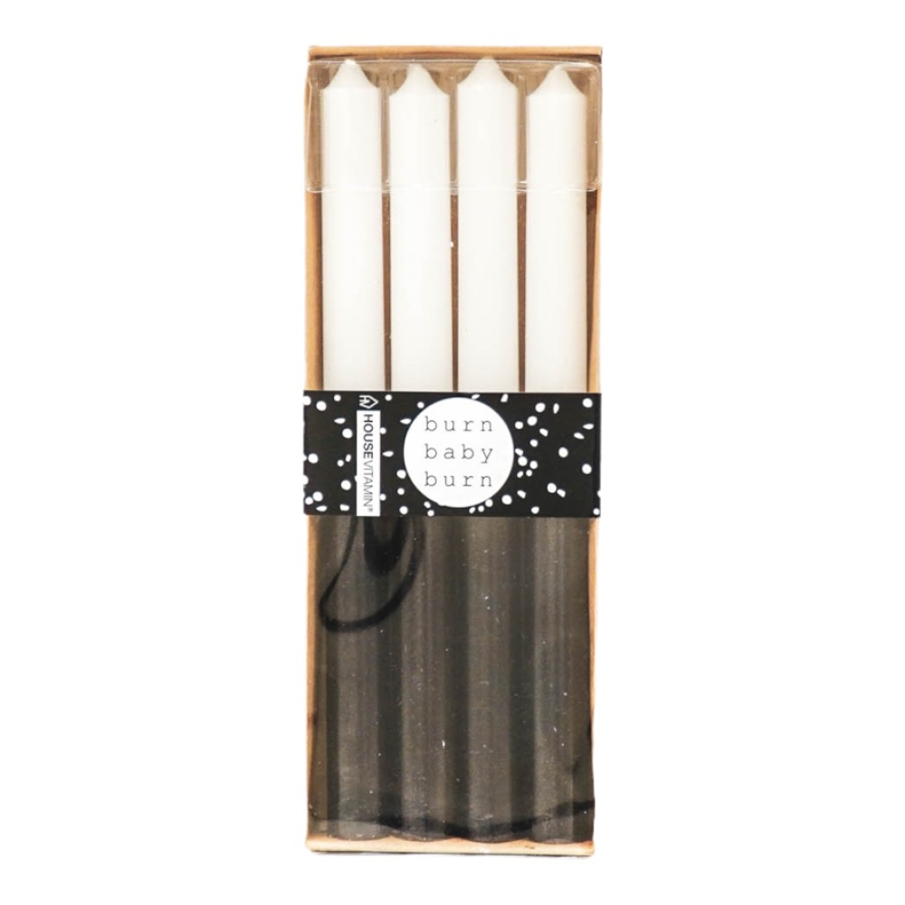 Deze zwart-witte kaarsen zijn ideaal voor mensen die houden van een monochroom kleurenschema met een edgy twist. Door hun lengte en kleurgebruik ogen ze zowel strak als speels – een unieke balans die niet vaak voorkomt. Ze passen moeiteloos in Scandinavische settings, moderne woonkamers of industriële ruimtes. Zet ze samen in één stijlvol kandelaar cluster of verspreid ze subtiel over je interieur voor een krachtig visueel effect. Ze branden rustig en geven een warme gloed, zonder geur, dus ook ideaal voor diners of rustige avonden.
