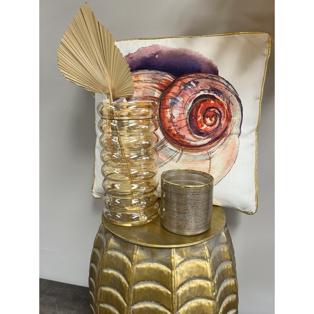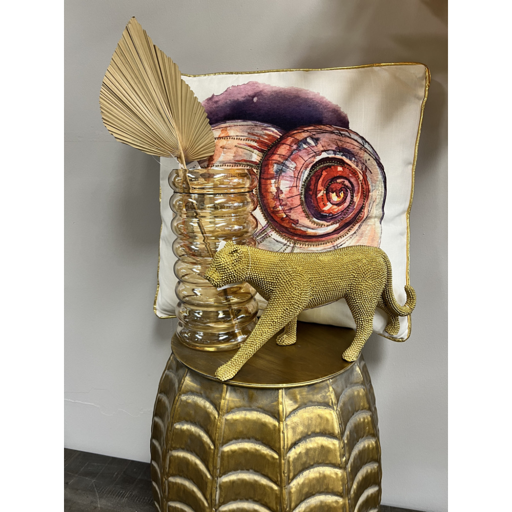 Het kussen is bewerkt met echte kraaltjes en heeft een gouden randje.