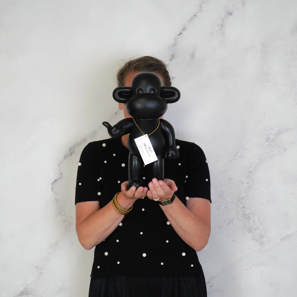 Deze brutale aap is ideaal voor ruimtes waar je echt een statement wilt maken. Door het grote formaat komt het beeld perfect tot zijn recht op de vloer, naast een dressoir, in een open hoek van de woonkamer of in een ruime hal. Ook in een kantoor, showroom of ontvangstruimte zorgt dit decoratieve object voor een sterke en stijlvolle eerste indruk. De zwarte kleur maakt het ornament veelzijdig en makkelijk te combineren met verschillende materialen zoals hout, metaal of glas. Het beeld kan solitair worden geplaatst voor een minimalistische look, maar werkt ook goed in combinatie met andere grote woonaccessoires voor een gelaagd interieur. Dankzij de krachtige houding en het opvallende design blijft het ornament vanuit elke hoek interessant om naar te kijken. Het brengt balans tussen speels en stoer en geeft elke ruimte een ontspannen, eigentijdse sfeer. Dit maakt het beeld bijzonder geschikt voor mensen die hun interieur bewust willen stylen met objecten die karakter en uitstraling hebben, zonder dat het geheel druk aanvoelt.