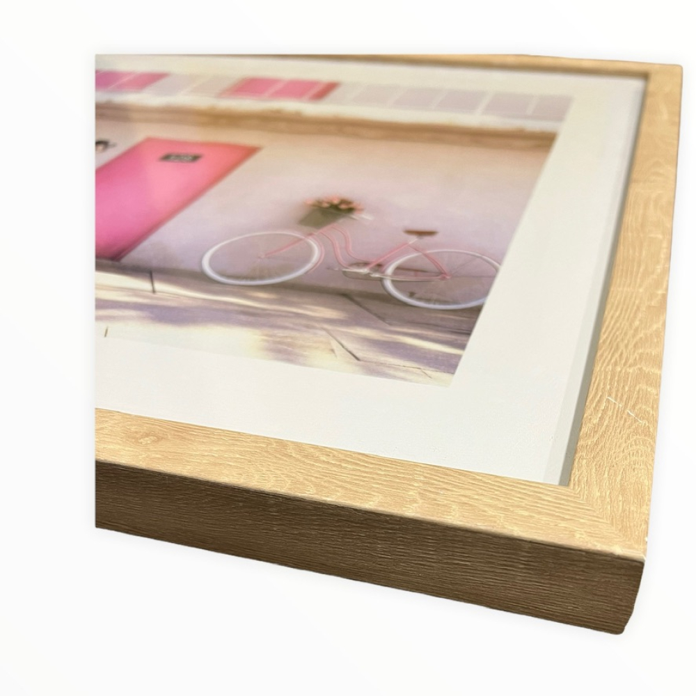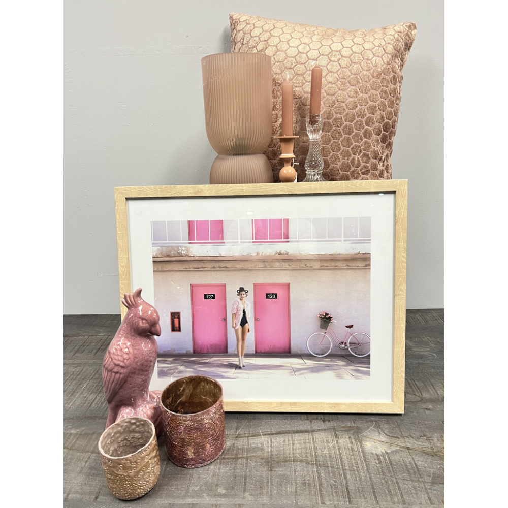 Stoere poster in mooie houten lijst met de afbeelding van een dame met roze deuren.
