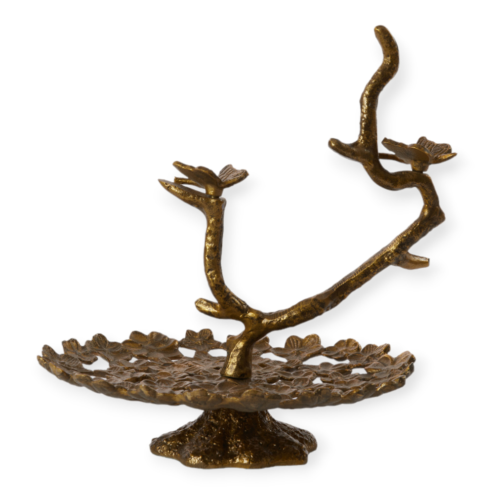 Prachtige bronskleurige schaal op voet bewerkt met vlinders.