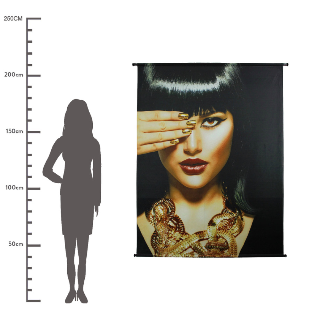 Dit wanddoek biedt veel meer dan alleen decoratie; het vertelt een verhaal. Cleopatra staat symbool voor kracht, schoonheid en mysterie, wat dit wanddoek een bijzondere en inspirerende toevoeging maakt aan jouw woonruimte. Het goudkleurige ontwerp brengt een gevoel van luxe en tijdloze klasse, waardoor het ideaal is voor woonkamers waar je een warm en uitnodigend gevoel wilt creëren. In een moderne setting zorgt het doek voor een opvallend contrast, terwijl het in een klassieker interieur juist harmonieus opgaat in de rijke uitstraling.